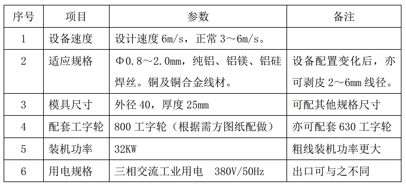 設(shè)備一般由800放線機(jī)、收線機(jī)、500剝皮機(jī)、張力機(jī)、電氣控制柜和清洗設(shè)備組成。技術(shù)參數(shù)如下: